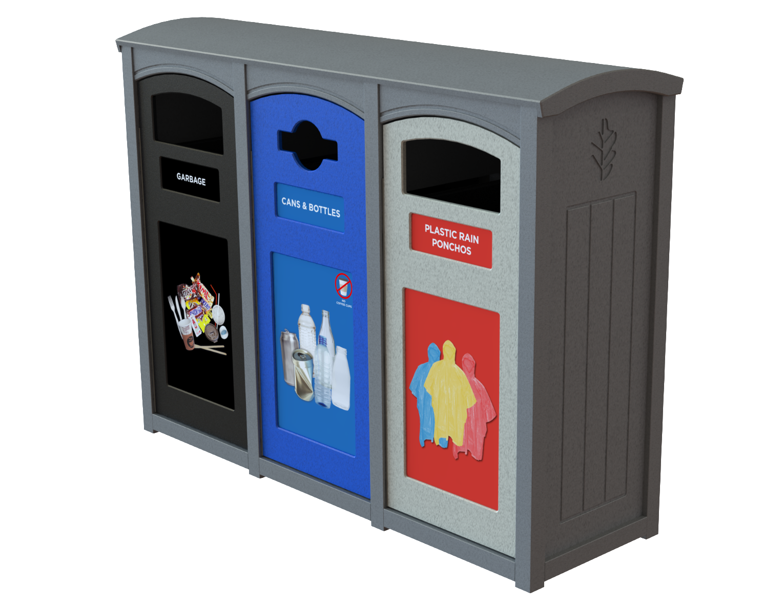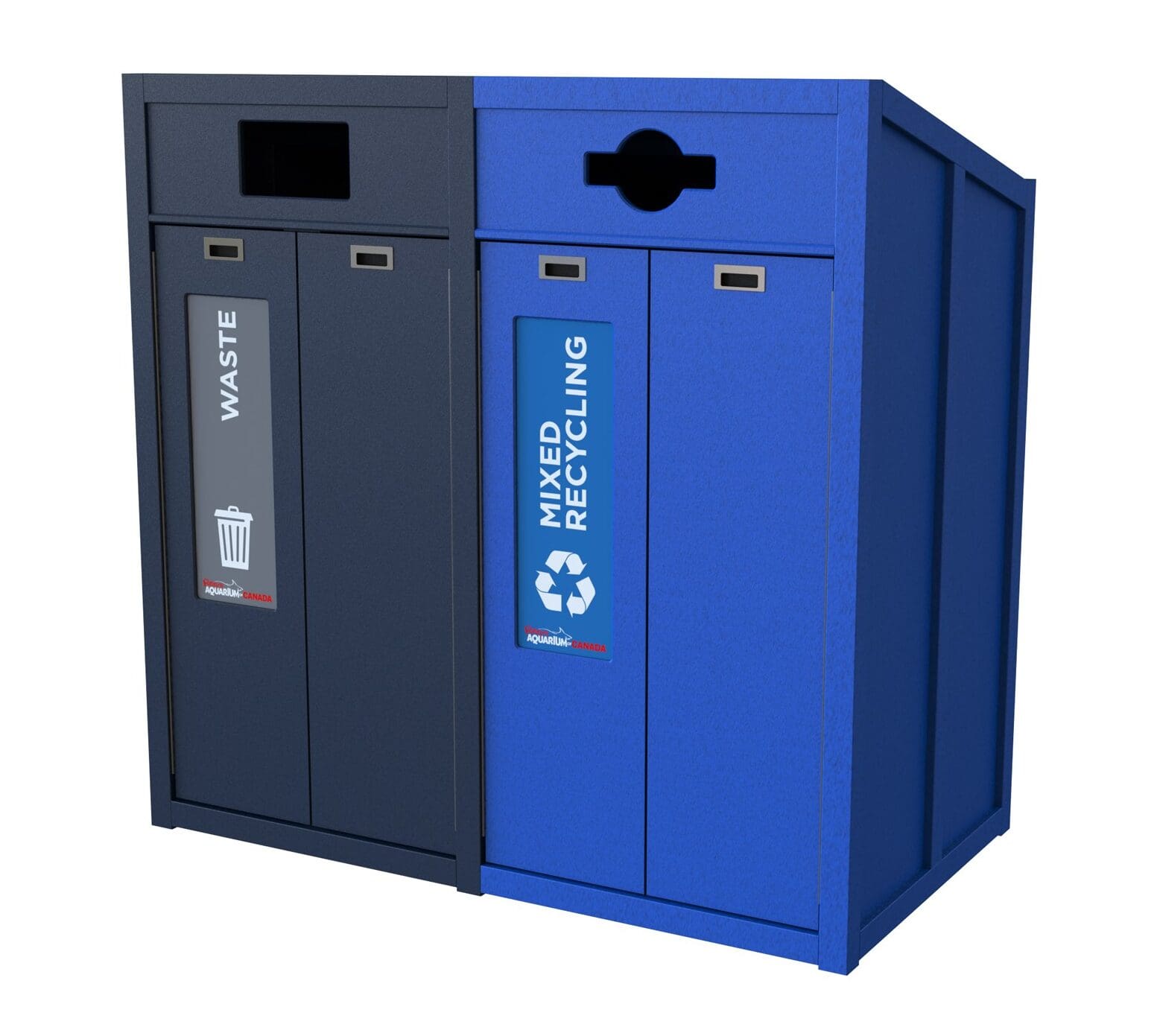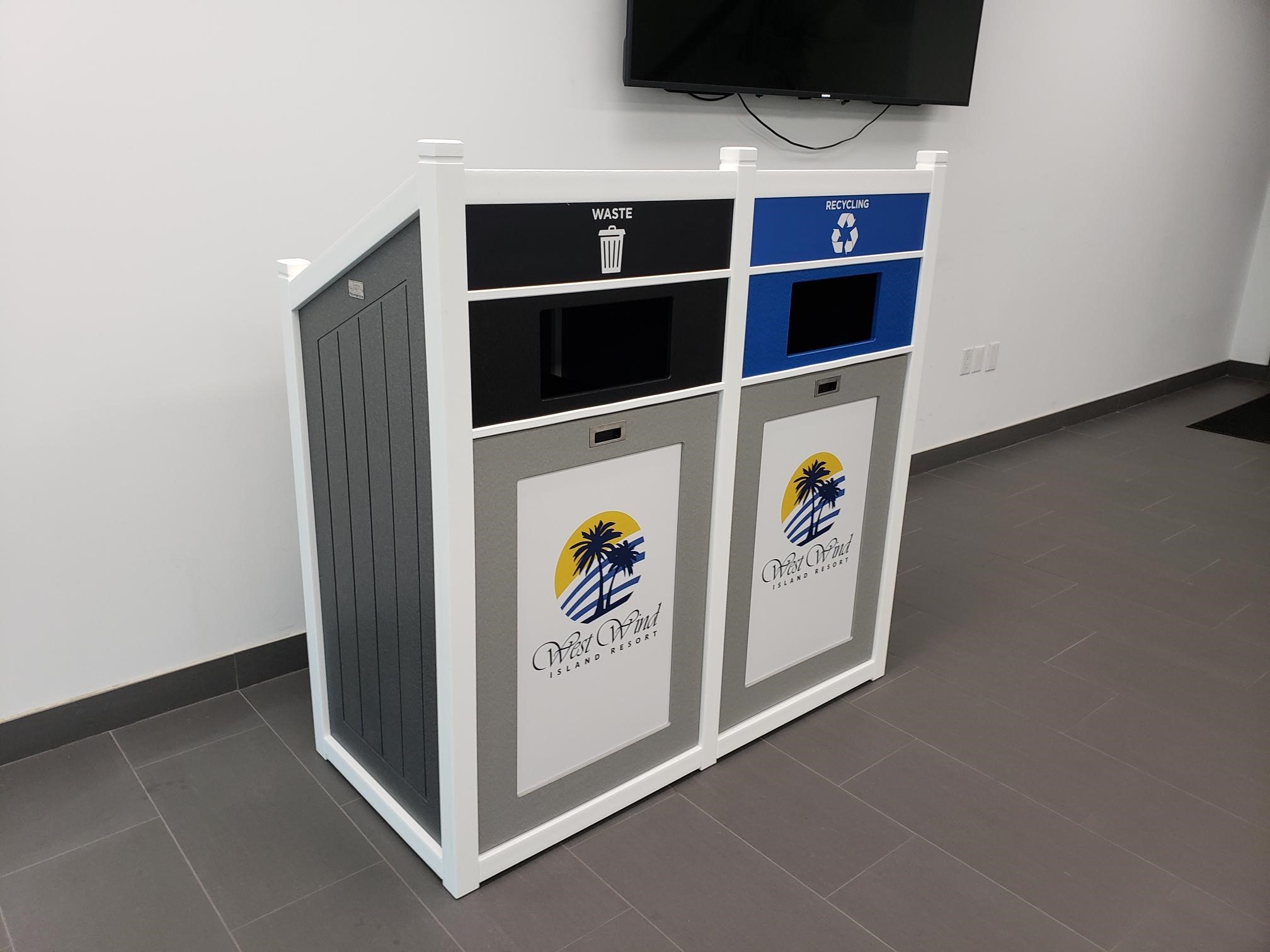 CleanRiver suggested a dome top recycling container to separate the recycling and garbage at the point of disposal. The units are attached so that the recycling and waste streams are always together even if the bins are moved, and the domed top prevents garbage from being left on top of the unit by visitors. The front opening door means the units are much easier to service; the liner pulls straight out for emptying rather than having to lift a heavy garbage bag up and out of the unit.
