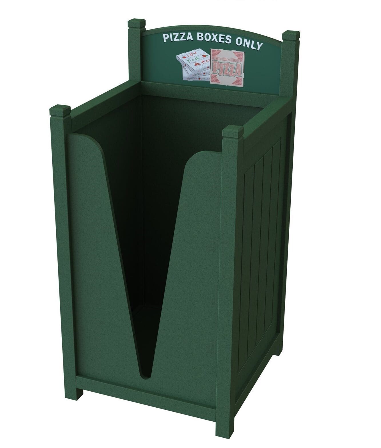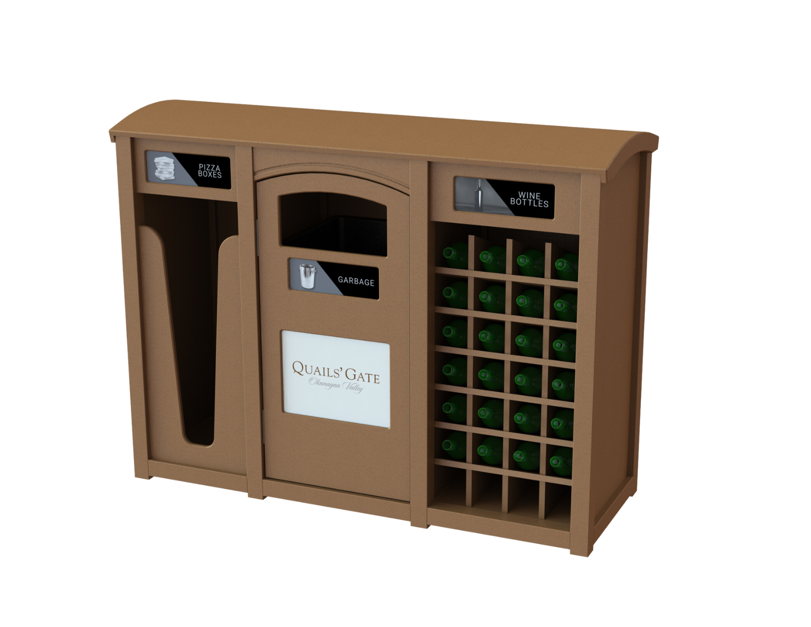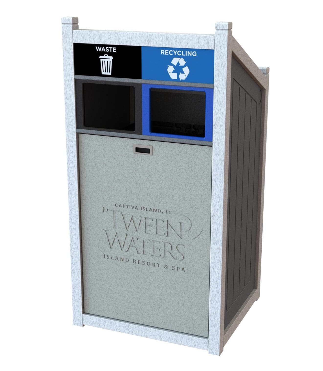 CleanRiver suggested a dome top recycling container to separate the recycling and garbage at the point of disposal. The units are attached so that the recycling and waste streams are always together even if the bins are moved, and the domed top prevents garbage from being left on top of the unit by visitors. The front opening door means the units are much easier to service; the liner pulls straight out for emptying rather than having to lift a heavy garbage bag up and out of the unit.