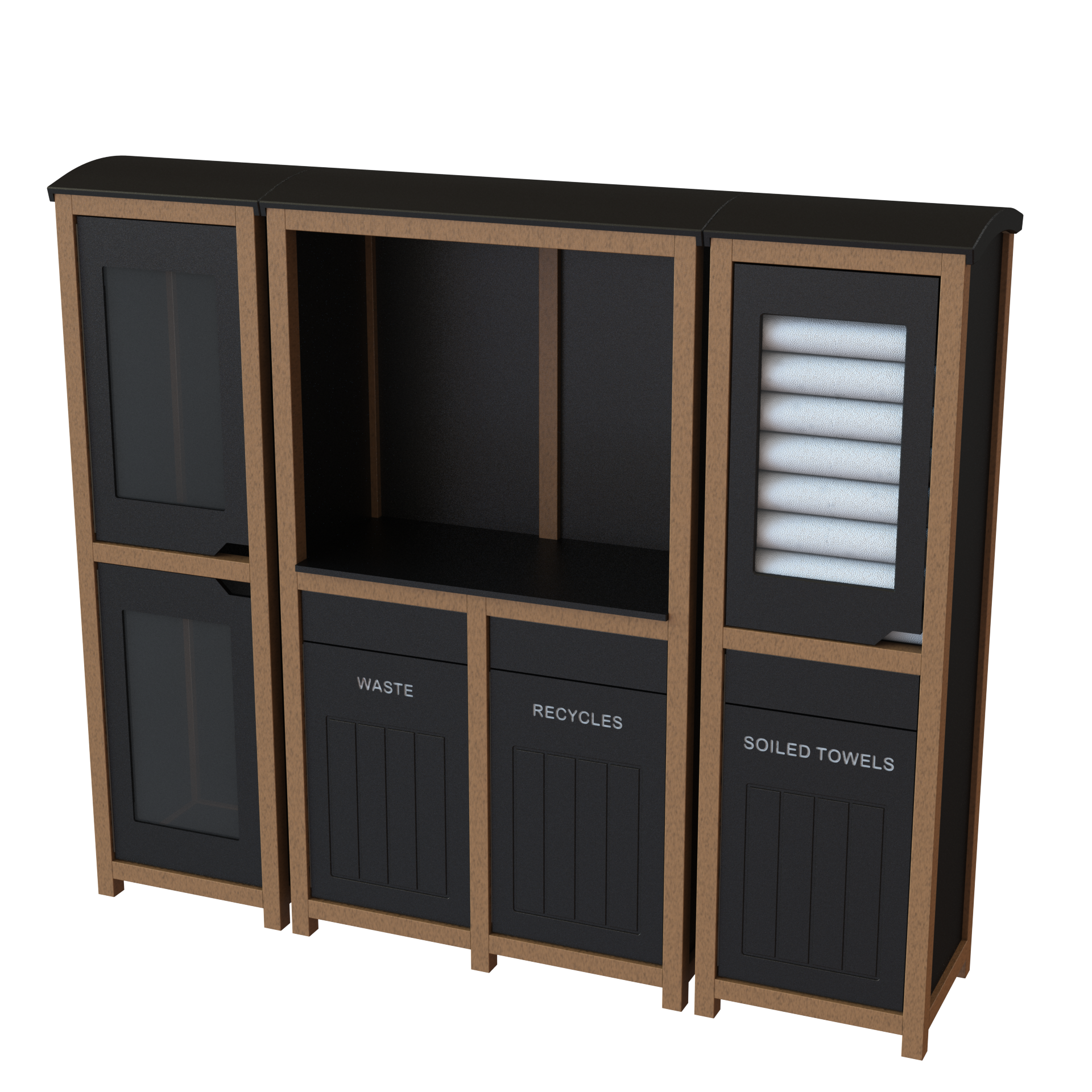 The Towel Rack provides a clean aesthetic and is dual purpose, it can be used for clean towel storage as well as to collect used towels. Additionally, this unit can be paired with any waste/recycling options.